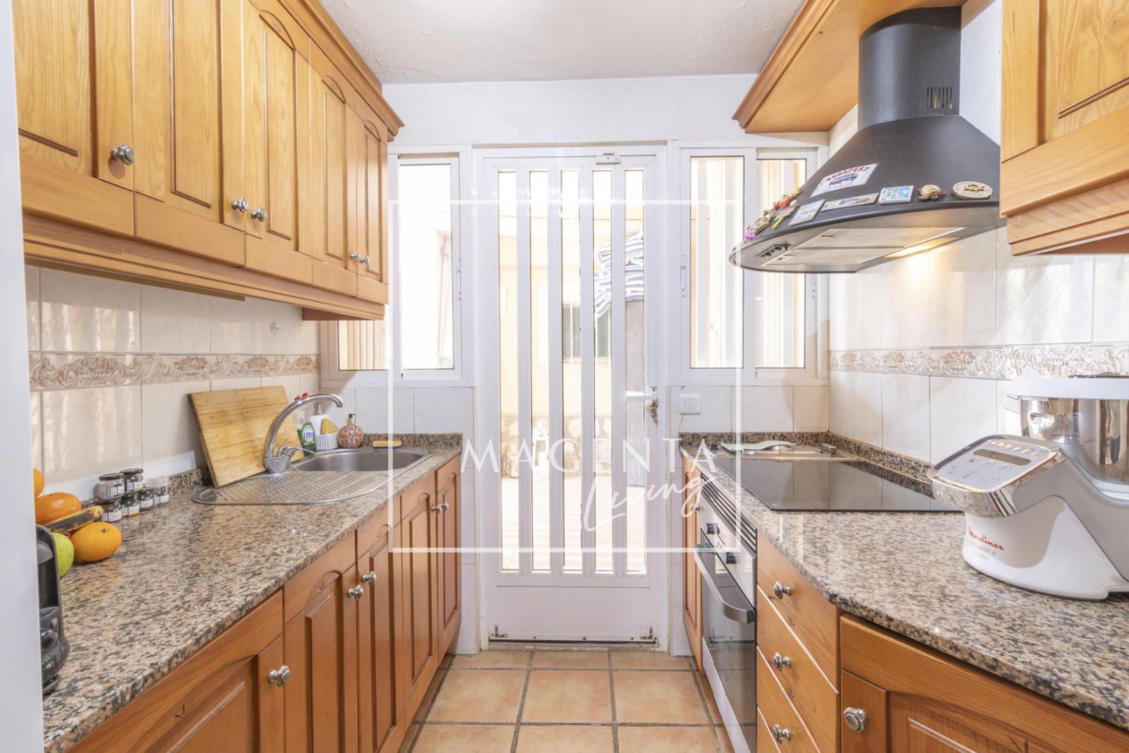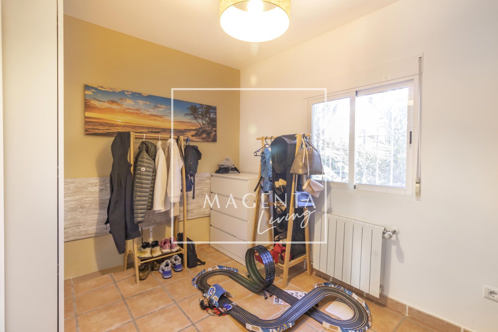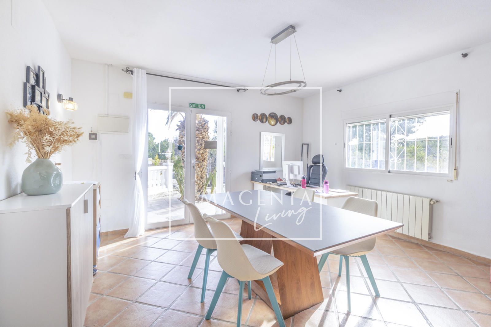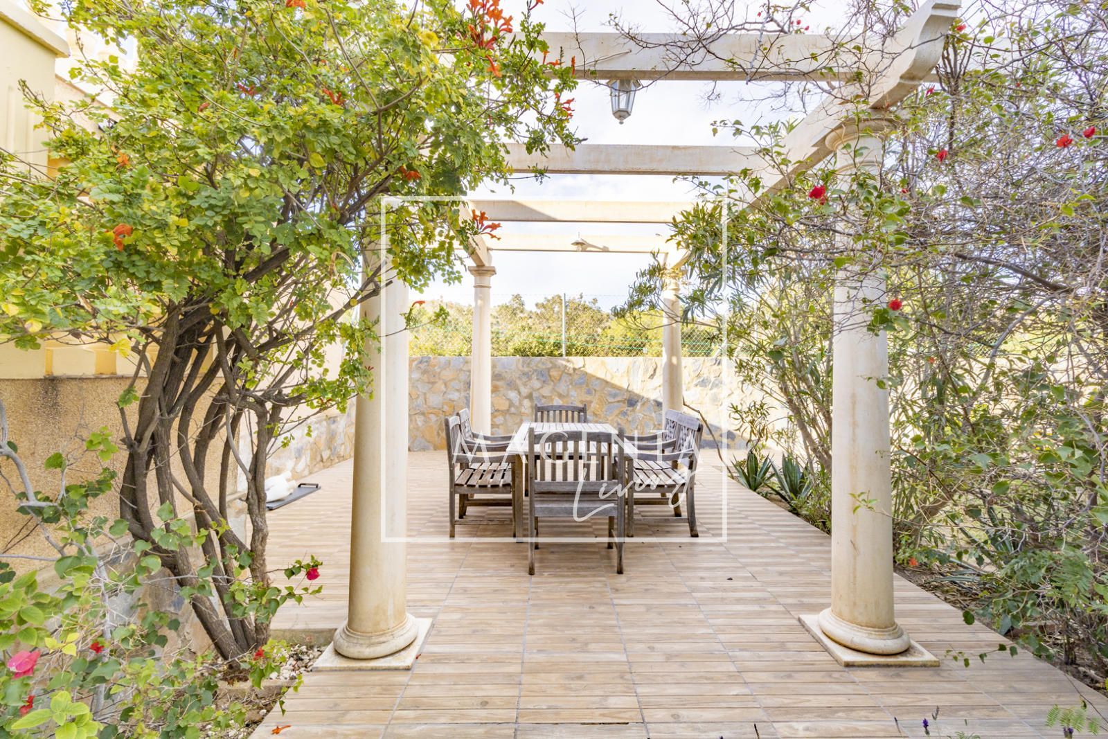 El exterior es, sin duda, uno de los grandes protagonistas de esta propiedad. El extenso jardín que rodea la vivienda ofrece distintos rincones llenos de encanto, perfectos para relajarse y disfrutar del clima mediterráneo durante todo el año. Encontramos una barbacoa, un lindo comedor exterior con pérgola, rodeado de árboles frutales y flores, un área chill-out, una zona infantil y múltiples espacios con plantas.
