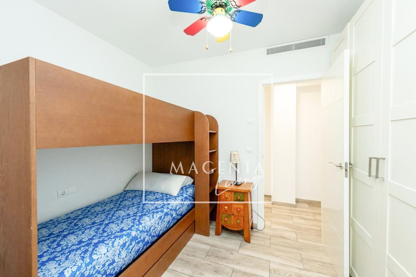 En cuanto a calidades, la vivienda dispone de carpintería interior lacada en blanco y cerramientos exteriores de aluminio con doble acristalamiento tipo Climalit, que favorecen el aislamiento térmico y acústico. El salón-comedor cuenta además con aire acondicionado tipo split, garantizando confort durante los meses más cálidos. Asimismo, la vivienda dispone de ductos de ventilación, lo que facilita la instalación de un sistema de aire acondicionado por conductos si se desea.
